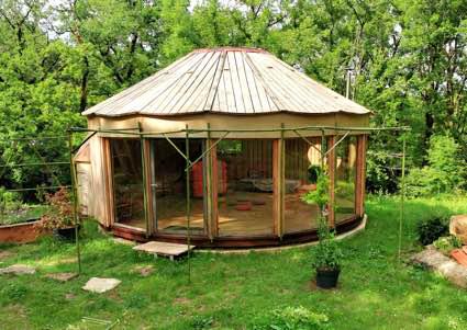 Les murs de la yourte s’ouvrent sur une demi-lune de baies vitrées, donnant sur la forêt de chênes.